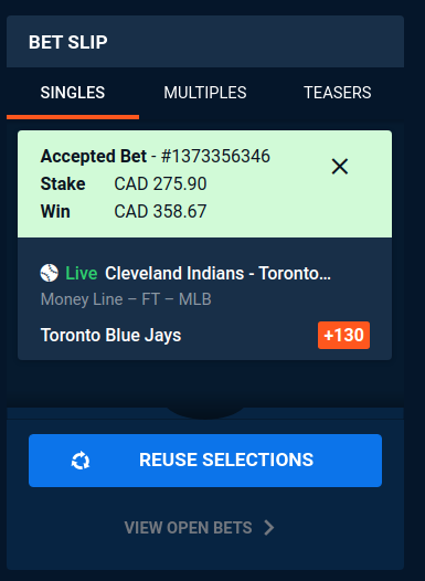 Jays -245 pregame, we have them +130 (live down 0-2).