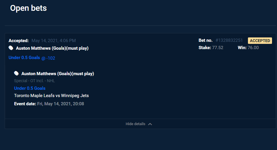 plommer ‹^› ‹(•_•)› ‹^› Since Jan 27, 2010 Messages 27,968 Score 1,297 Tokens 0 May 14, 2021 • Jun 7, 2021 • 359 Replies 13K Views #351 Winnipeg Jets vs Toronto Maple Leafs Special – OT Incl. – NHL Auston Matthews (Goals)(must play) Under 0.5 Goals -102