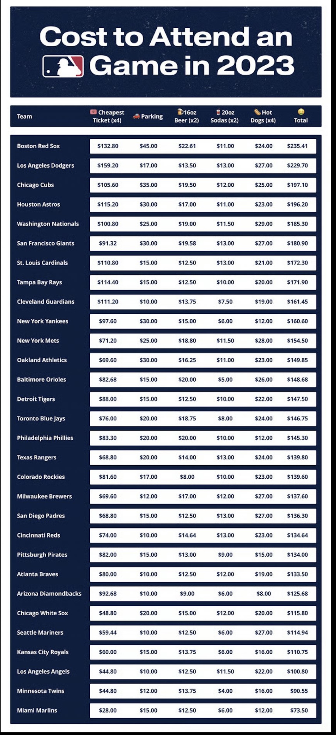 That chart doesn’t factor in fans bringing food and drinks into the ballpark (I actually bring three sealed 16 oz waters into each game for my sons and I but I enjoy the ballpark food so I’m happy to pay for it).