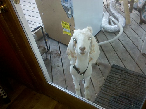 The horse went for a ride with Maddie. The goat was inconsolable. We stayed outside to make sure our goat security held. It did. We went inside. Now the goat is crying and softly butting his head on the door. I think it may have been weaned too soon. It's really cute and heartbreaking all at the same time. I don't think he's leaving his position any time soon. This did give me the brilliant idea that I can feed him from the back door. This is a splendid revelation since the snow will be here shortly.