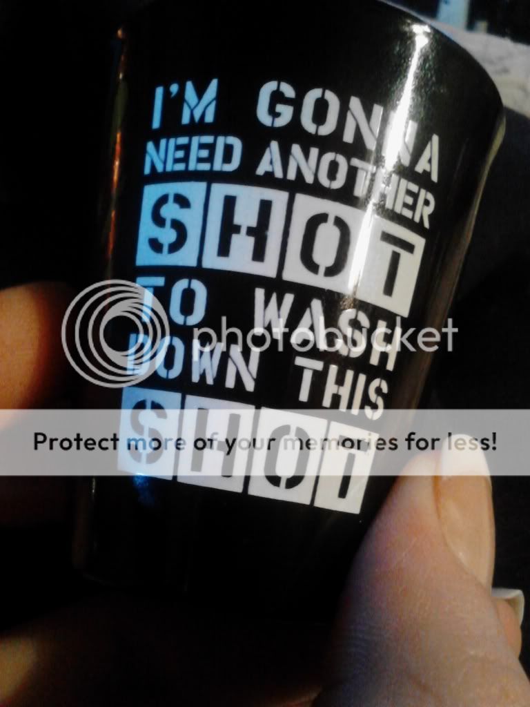 We got these, glass is Steve's and the shot glass is mine (because I broke my BADASS one, it fell off the chair and onto a bottle of whiskey and broke :tears:)