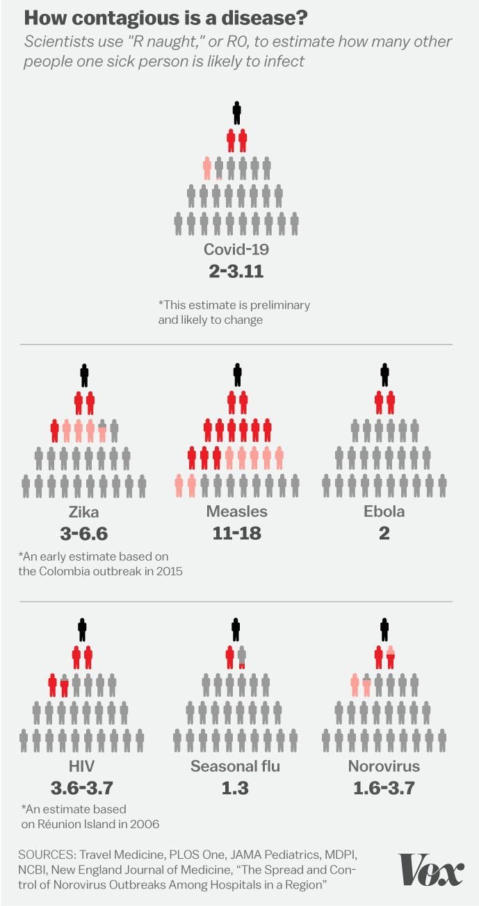 There’s another way that Covid-19 is a tougher adversary than the seasonal flu: Its R0 (“R nought”) is over 2, indicating that it’s more contagious than the typical flu. R0 estimates the number of people an average infected person spreads the disease to. “R0 is important because if it’s greater than 1, the infection will probably keep spreading, and if it’s less than 1, the outbreak will likely peter out,” the Atlantic’s Ed Yong explains. Covid-19’s R0 is substantially higher than 1, giving more reason for concern.